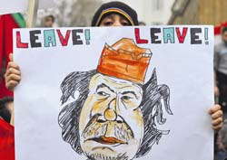 اشتباكات وبعد ساعات من اصدار القذافي اوامره بالهجوم على المحتجين، أوردت صحيفة "قورينا" الليبية الالكترونية ان الجيش الليبي نشر "اعداداً كبيرة" من الجنود في صبراته على مسافة 80 كيلومتراً غرب طرابلس بعدما دمر محتجون كل مكاتب اجهزة الامن تقريبا. وقالت ان المحتجين احرقوا فيها مكاتب الامن ومباني التحقيقات الجنائية واللجان الثورية، ومزقوا كل صور القذافي. لكن امين مؤتمر الشعب العام الليبي محمد الزوي صرح في مؤتمر صحافي بعد منتصف الليل بان الهدوء "عاد الى معظم المدن الكبرى" في البلاد حيث "استعادت قوات الامن والجيش مواقعها". وبثت قناة "الجزيرة" الفضائية القطرية ان سفينة حربية ليبية وصلت الى ساحل مالطا بعدما كانت ارسلت من طرابلس لضرب بنغازي اثر رفض قبطانها اوامر القذافي. وفي وقت لاحق تبعتها سفينة اخرى. وكان طياران لجأا بمقاتلتيهما الى مالطا الاثنين بعدما رفضا اوامر بقصف بنغازي. وامس، اقرت السلطات الرسمية الليبية بمقتل 300 شخص بينهم 58 جندياً منذ بدء الاضطرابات.