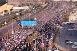 ولدى وصول المتظاهرين الى الدوار، رفعوا ايديهم وهتفوا بسقوط الحكومة ورئيسها الامير خليفة بن سلمان ال خليفة الذي يتولى منصبه منذ 40 سنة. واطلق المحتجون على تظاهرتهم اسم "مسيرة الوفاء للشهداء". وهي الاولى تنظم بدعوة من جهات سياسية، اذ كانت التظاهرات السابقة تتم بدعوة من ناشطين. وطغى الطابع الشيعي بقوة على المسيرة التي شارك فيها عدد كبير من النساء اللواتي لبسن الاسود وعلى رؤوسهن عصبة بيضاء كتب عليها: "لا حوار"، في اشارة الى رفض الدعوة الى الحوار التي وجهها ولي العهد الامير سلمان بن حمد ال خليفة.