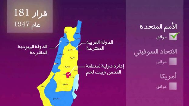 وفي 29 تشرين الثاني (نوفمبر) 1947 صوتت الجمعية العامة للأمم المتحدة في نيويورك على القرار 181 الذي حاز على تأييد 33 دولة بينها الولايات المتحدة والاتحاد السوفياتي وفرنسا، وعارضته 13 دولة بينها الدول العربية، وامتنعت 10 دول عن التصويت بينها بريطانيا. ولم يستغرق التصويت أكثر من ثلاث دقائق.