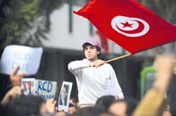 تظاهرات وقد رفع المتظاهرون امس الذي طوقهم عدد كبير من رجال الامن علم تونس وأطلقوا هتافات تطالب بـ"برلمان ودستور جديد".كذلك, رفعوا شعارات تدعو الى "الثورة ضد بقايا نظام بن علي" ولافتات كتب فيها "وزير المال صديق الطرابلسية", في اشارة الى عائلة زوجة الرئيس السابق و"حزب بن علي ارحل", و"يا بوليس يا ضحية تعال وشارك في الثورة" قبل أن يؤدوا النشيد التونسي. وكانت التظاهرة الجديدة أقل توتراً من تلك التي خرجت في الايام الاخيرة والتي أطلق فيها رجال الشرطة قنابل الغاز المسيل للدموع, وأشبعوا متظاهرين ضرباً.