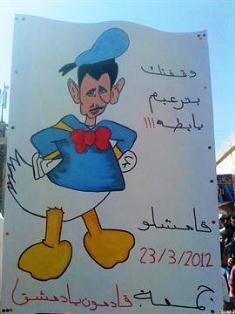 Dozens of YouTube videos on the subject have been posted, including one showing Assad in the form of a duck with red lips holding a machine gun.